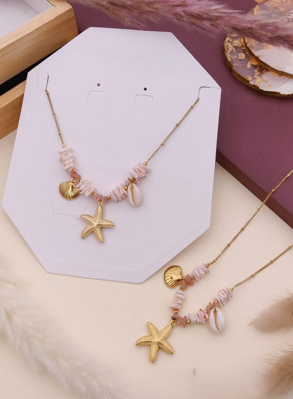 - Triple Charm Elegance: Gold starfish, scallop shell, and white cowrie shell for oceanic allure